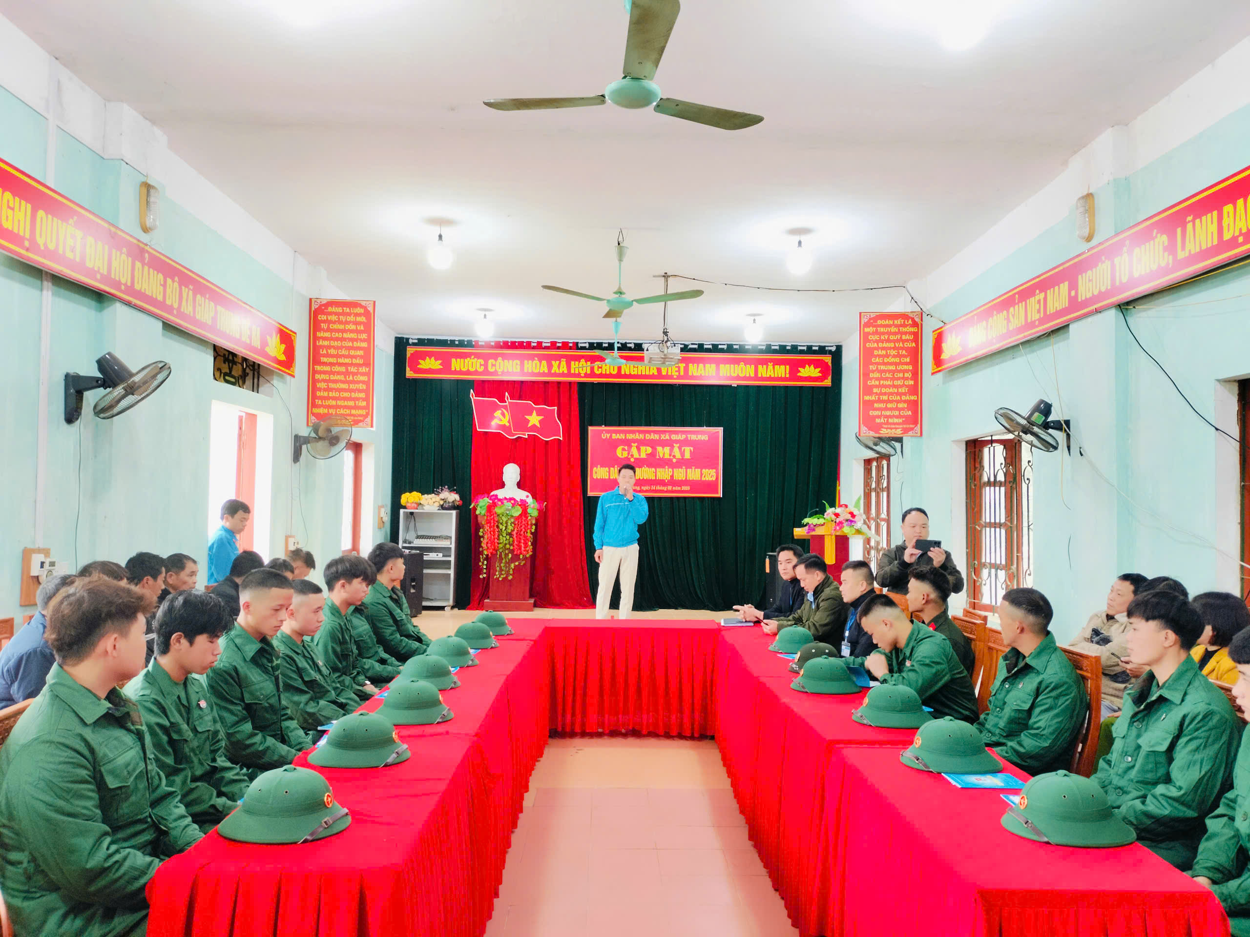 Sáng ngày 14/02/2025 UBND xã Giáp Trung tổ chức gặp mặt tân binh lên đường nhập ngũ năm 2025. tới dự với buổi lễ về phía huyện có đồng chí Ma Văn Tỏe ủy viên ban thường vụ huyện ủy, phó chủ tịch UBND huyện, tổ trưởng tổ công tác, về phía xã còn có thường trực Đảng ủy-HĐND-UBND, UBMTTQ các ban ngành của xã Giáp Trun; các tân binh và thân nhân gia đình.
