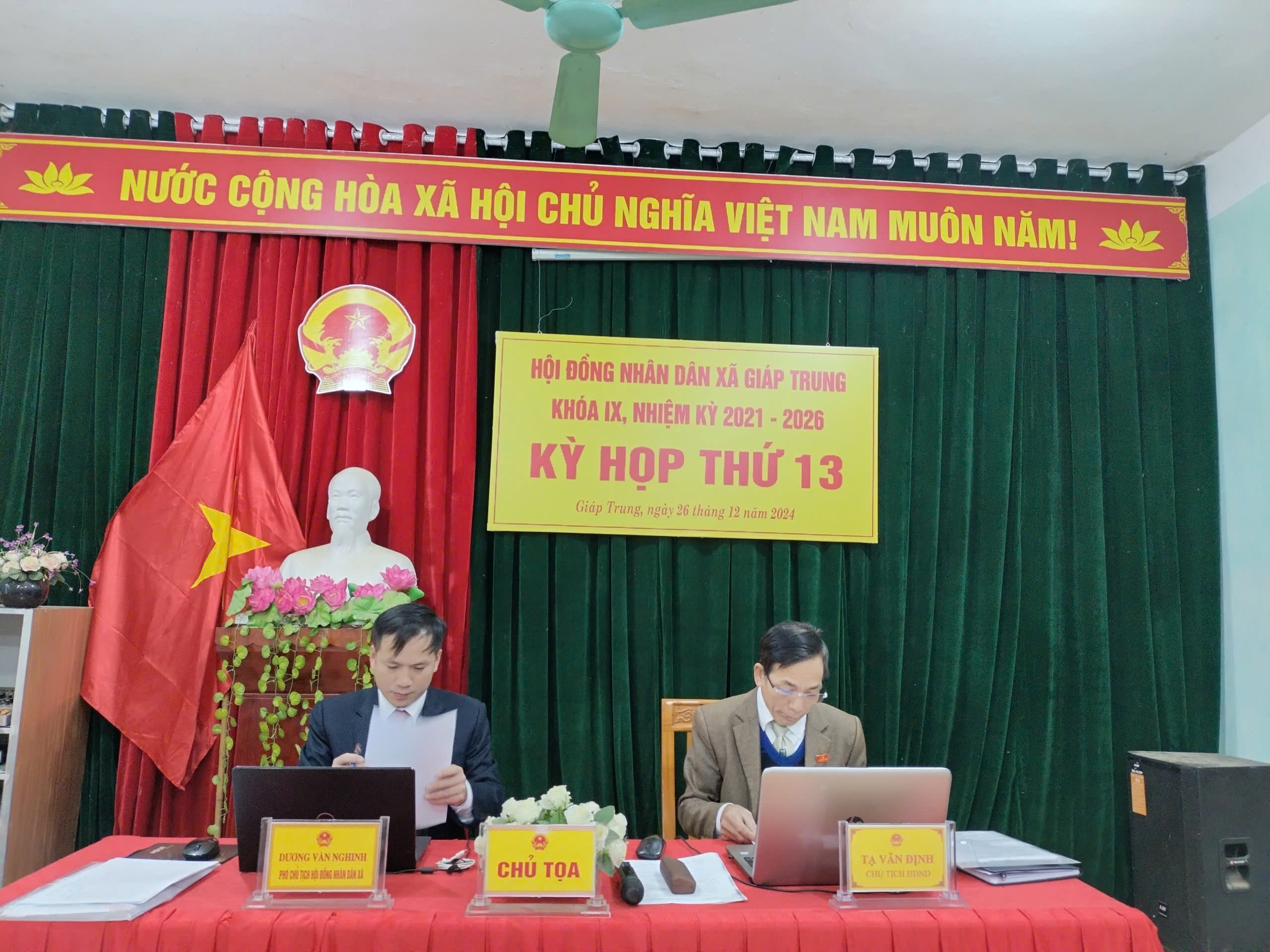 ngày 20 tháng 12 năm 2024 Hội đồng nhân dân xã Giáp Trung tổ chức kỳ họp thứ 13 cuối năm 2024 đến dự chỉ đạo có đồng chí Ma Văn Tỏe UV ban thường vụ huyện Ủy tổ trưởng tổ công tác cấp ủy và có đồng chí Hoàng Văn Tuấn Ủy viên BCH đảng bộ Huyện Bí thư Đảng ủy xã, kỳ họp có mặt 17 các ông bà Đại biểu và các nghành chuyên môn trên địa bàn xã kỳ họp đã diễn ra thành công tốt đẹp trong 1/2 ngày
